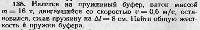 138.Налетев на пружинный буфер, вагон массой (m = 16) т, двигавшийся со скоростью (v = 0{,}6) м/с, остановился, сжав пружину на (Delta l = 8) см. Найти общую жесткость (k) пружины буфера.