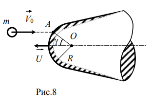 Гладкая частица сферической формы массой m, которую можно рассматривать как материальную точку, ударяется со скоростью V0  о гладкую массивную преграду, которая движется со скоростью U const  . Угол, образованный векторами V0  и U  , равен . Массу преграды считать бесконечной. На рис. 5, 6 преграда имеет форму плоской стенки, на рис.7 – форму острого конуса с углом раствора γ, а на рис. 8 – форму конуса сферической головной частью радиусом R. Удар частицы о сферическую поверхность происходит в точке А, расположенной под углом γ относительно оси преграды. При этом АО = R.
