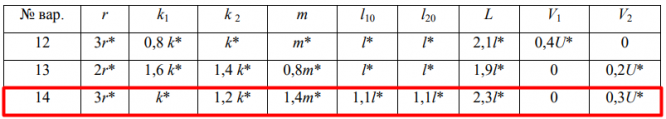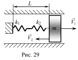 Каждая колебательная система (КС), представленная на рис. 28, 29, 30, 31, состоит из шайбы массой m и двух упругих пружин, имеющих жесткости k1 и k2 . Движение КС происходит в окружающей среде с малыми вязкими свойствами (малым коэффициентом сопротивления r). На рис. 28, 30 шайба колеблется под действием пружин, соединенных параллельно, а на рис. 29, 31 колебания происходят под действием пружин, соединенных последовательно. Массой пружин можно пренебречь. На рис. 28, 29 КС имеет горизонтальное расположение, а на рис. 30, 31 вертикальное расположение в поле силы тяжести. Длины 1-ой и 2-ой пружин в недеформированных состояниях равны l10 и l20. На рис.28, 30 L - длина каждой пружины в деформированном состоянии при t=0. На рис.29, 31 L - общая длина двух пружин в деформированном состоянии при t=0. Возможные векторы начальной скорости шайбы равны V1 , V2 . Шайбу, находящуюся в положении равновесия, смещают до расстояния L, а затем импульсом придают ей в начальный момент времени t=0 скорость V1 или V2 , в соответствии с заданием (см. таблицы № 10 - 13). В результате КС приходит в колебательное движение.