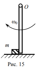 Однородный жёсткий стержень длиной l=0,5 м и массой М=0,5 кг может свободно без трения вращаться вокруг горизонтальной оси О. При прохождении стержнем вертикального положения с угловой скоростью 0 , он своим нижним концом ударяет по маленькому кубику массой m=0,1 кг, который после удара движется в плоскости рисунка (рис. 15).