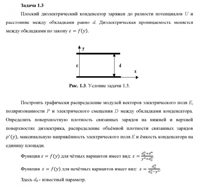 Таблица 1.3. Значения параметров n и d варианта Плоский диэлектрический конденсатор заряжен до разности потенциалов U и расстояние между обкладками равно d. Диэлектрическая проницаемость меняется между обкладками по закону =f(y). Построить графически распределение модулей векторов электрического поля Е, поляризованности Р и электрического смещения D между обкладками конденсатора. Определить поверхностную плотность связанных зарядов на нижней и верхней поверхностях диэлектрика, распределение объёмной плотности связанных зарядов ’(y), максимальную напряжённость электрического поля Е и ёмкость конденсатора =f(у) для нечётных вариантов имеет вид: =(d0 n +dn )/(y =f(y) для чётных вариантов имеет вид: =d0 n /(d0 n -y n ).