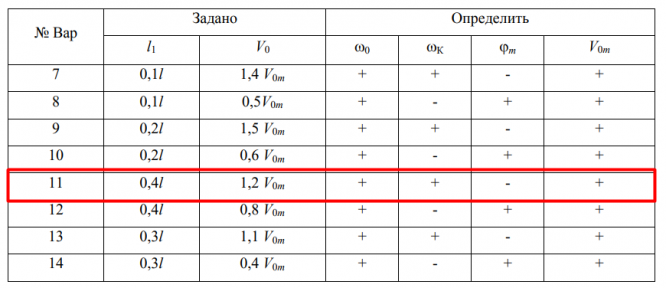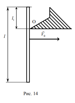 Однородный жёсткий вертикальный стержень длиной l=1 м и М=1 кг, движущийся поступательно в плоскости рисунка с постоянной горизонтальной скоростью V0, налетает на край массивной преграды (рис. 14). После удара стержень вращается вокруг оси O перпендикулярной плоскости рисунка. Ось вращения стержня совпадает с ребром преграды и проходит через точку контакта стержня с преградой, так что точка контакта лежит выше центра тяжести стержня (рис. 14). Потерями механической энергии при вращении стержня после удара пренебречь.