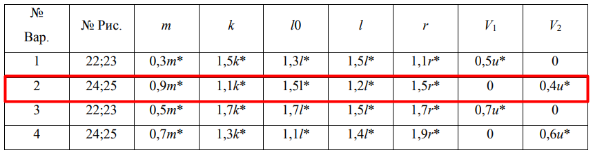 Дополнительно (в соответствии с общими условиями задачи 3) рассчитать все требуемые величины и вывести уравнение затухающих колебаний горизонтального пружинного маятника (см. рис. 26), у которого масса шарика m, а длина и жёсткость пружины равны соответственно l0 и k (см. табл. 8). В начальный момент времени шарик смещают так, что длина пружины становится равной l, а за тем кратковременным воздействием сообщают шарику скорость 1 v или 2 v . В результате система приходит в колебательное движение в горизонтальном направлении. Трением шарика о боковую поверхность пренебречь.