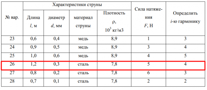 определить частоту колебаний и длину волны i -ой гармоники стоячей волны; для этой гармоники нарисовать вдоль струны качественную картину: а) стоячей волны амплитуд смещений точек струны; б) распределения скоростей точек струны для момента времени t = 0,25T, где T - период колебания струны для i -ой гармоники. Исходные данные для каждого варианта задачи представлены в таблице № 19