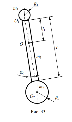 На рис. 33 представлен физический маятник (ФМ), состоящий из двух шаров радиусами R1 и R2 , и массами соответственно m1 и m2. Шары жёстко скреплены с помощью стержня длиной L и массой m3. Через т. О стержня проходит горизонтальная ось вращения ФМ, расположенная на расстоянии l0 от верхнего конца стержня, так что ФМ может совершать вращательное движение в вертикальной плоскости. ФМ, находящийся в положении равновесия, отклоняют на угол 0 (см. таблицу № 15), а затем в начальный момент времени t=0 отпускают. В результате ФМ начинает совершать свободные незатухающие колебания, т.е. в этой задаче коэффициент сопротивления считается равным нулю (r = 0).
