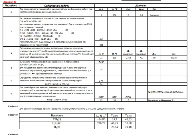 Определить направление возможного самопроизвольного протекания реакции и вычислить константу равновесия Kp при температуре T. t, °C 2СO(г) + O2(г) ↔ 2CO2(г) 94 Для данной реакции известно значение константы равновесия Kp при температуре T и давлении p. Определить равновесный состав смеси, если в начальный момент времени в ней находилось заданное количество νi или mi или Vi соответствующих компонентов. H2(г) I2(г) 2HI(г) Kp=50 T=444°C p=1бар MI=127г/моль H2(г) + I2(г) ↔ 2HI(г)