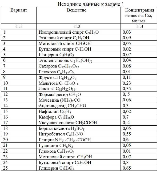 1. Рассчитайте массовую долю ω,% данного вещества (П.2) в водном растворе с заданной молярной концентрацией См (моль/л) (П.3) используя данные для своего варианта (П.1) из таблицы 1. Вычислите моляльную концентрацию Сm этого раствора. Плотность раствора примите равной 1 г/см3.