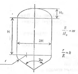 Найти оптимальные размеры цилиндрической ёмкости с выпуклой крышкой и коническим днищем с отбортовкой заданного объёма V