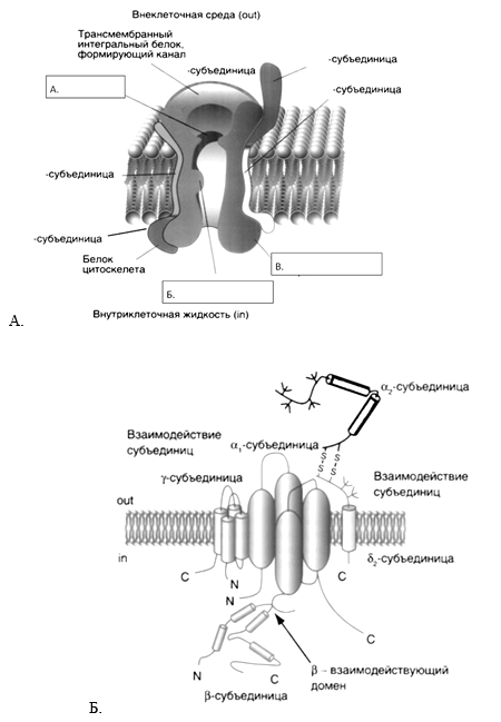 Сравните две схемы ионного канала. Обозначьте составные части канала. На рисунке А подпишите субъединицы в соответствии с рисунком Б (см. «Атлас по физиологии» Камкина А. Г., т.1., стр. 35).