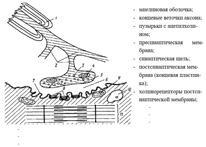 13. Подпишите номера к структурным элементам нервно-мышечного синапса.