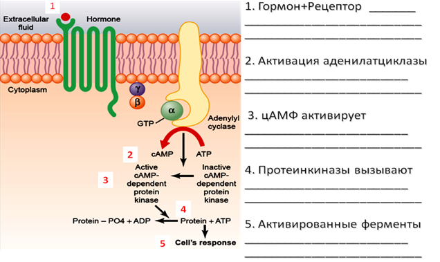 7. Допишите этапы влияния гормонов через мембранные рецепторы: