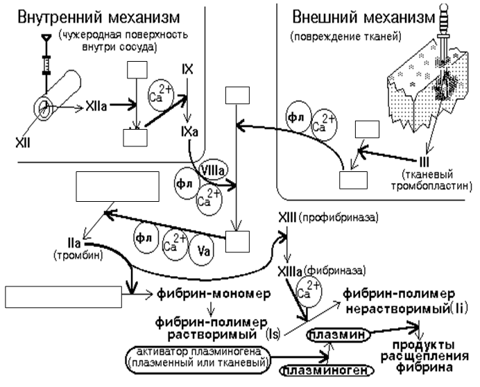 6. На рисунке представлена схема ферментативно-коагуляционного гемостаза. Вставьте в пустые прямоугольники плазменные факторы свёртывания крови.