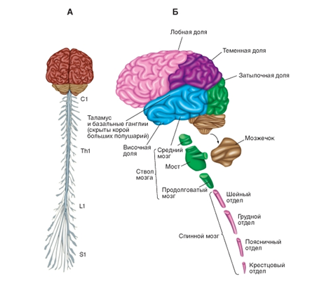 А -головной и спинной мозг со спинальными нервами. Б - основные компоненты центральной нервной системы. Показаны также четыре главные доли коры больших полушарий: затылочная, теменная, лобная и височная