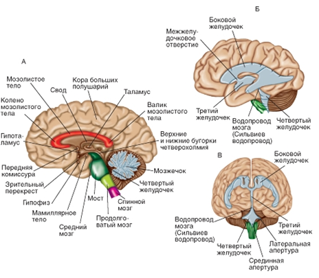 Рис. 2. Головной мозг. А - среднесагиттальный срез головного мозга. Обратите внимание на относительное расположение коры больших полушарий, мозжечка, таламуса и ствола мозга, а также различных комиссур. Б и В - система желудочков мозга in situ - вид сбоку (Б) и спереди (В)