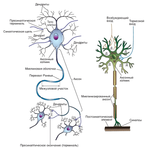 Типичный нейрон обладает воспринимающей поверхностью в виде тела (сомы) и нескольких отростков – дендритов, на которых находятся синапсы, т.е. межнейронные контакты. Аксон нервной клетки образует синаптические связи с другими нейронами или с эффекторными клетками. Коммуникативные сети нервной системы складываются из нейронных цепей, образованных синаптически взаимосвязанными нейронами.