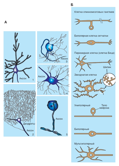 А - нейроны разнообразной формы: 1 - нейрон, напоминающий пирамиду (пирамидные клетки коры больших полушарий); 2 - клетки Пуркинье в коре мозжечка; 3 - постганглионарный симпатический мотонейрон; 4 - альфа-мотонейрон спинного мозга, мультиполярный, с радиальными дендритами; 5 - сенсорная клетка спинального ганглия; не имеет дендритов, ее отросток разделяется на две ветви: центральную и периферическую, псевдоуниполярные нейроны. Б - типы нейронов