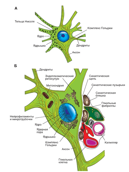Рис. 4. Нейрон. А - органеллы нейрона. На поверхности нейрона - синаптические окончания. Б - Схема соответствует электронно-микроскопической картине. Видны ядро, ядрышко, хроматин, ядерные поры. В цитоплазме - митохондрии, шероховатый эндоплазматический ретикулум, аппарат Гольджи, нейрофиламенты и микротрубочки. На наружной стороне плазматической мембраны - синаптические окончания и отростки астроцитов.