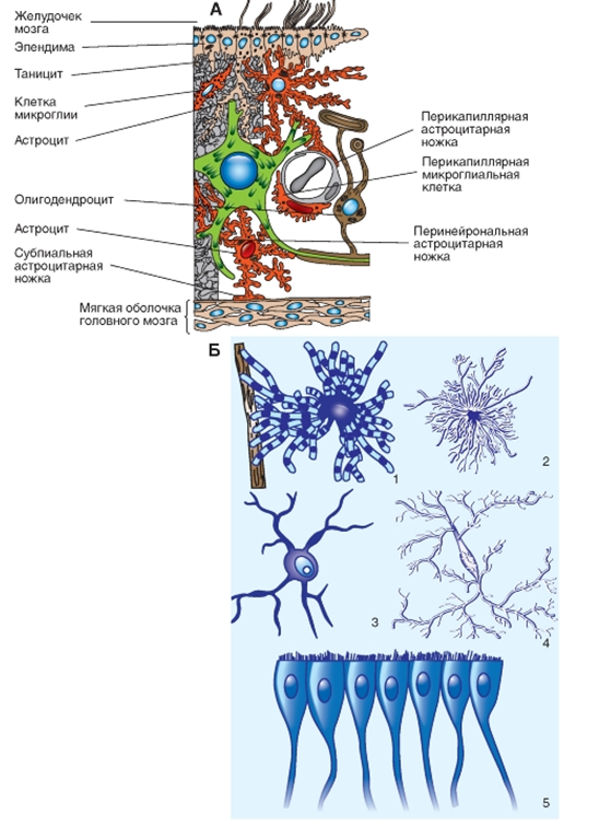 Рис. 6. Ненейронные клетки. А - схематическое представление ненейронных элементов ЦНС: два астроцита, ножки отростков которых заканчиваются на соме и дендритах нейрона, а также контактируют с мягкой мозговой оболочкой и/или капиллярами; олигодендроцит формирует миелиновую оболочку аксонов; клетки микроглии и клетки эпендимы. Б - разные типы клеток нейроглии в ЦНС: 1 - фибриллярный астроцит; 2 - протоплазматический астроцит; 3 - олигодендроцит; 4 - клетки микроглии; 5 - клетки эпендимы