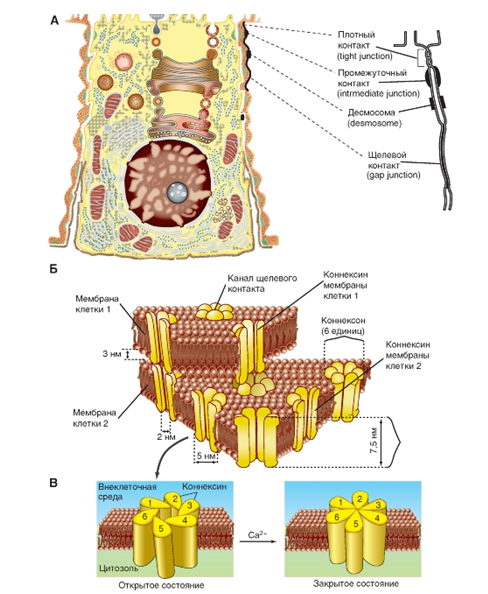 Рис. 7. Межклеточные контакты и структура щелевого контакта.