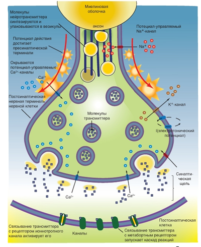 Механизм высвобождения трансмиттера. Во время деполяризации в нервном окончании возникает не только входящий ток Na+. Мембрана окончания аксона имеет и потенциал-управляемые Ca2+-каналы, через которые во время деполяризации ионы Ca2+ проникают в синаптическое окончание. Одновременно ионы Ca2+ дополнительно выходят из эндоплазматического ретикулума. В синаптическом окончании в зоне пресинаптической мембраны расположено большое число синаптических пузырьков (везикул) с медиатором (трансмиттером).
