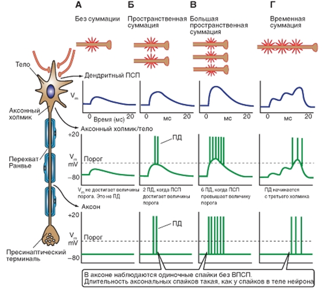 В зоне синапса локальный возбуждающий постсинаптический потенциал (ВПСП) распространяется пассивно электротонически по всей постсинаптической мембране клетки. Это распространение не подчиняется закону «все или ничего». Если большое число возбуждающих синапсов возбуждаются одновременно или почти одновременно, то возникает явление суммации, проявляющееся в виде возникновения ВПСП существенно большей амплитуды, что может деполяризовать мембрану всей постсинаптической клетки. Если величина этой деполяризации достигает в области постсинаптической мембраны порогового значения (10 мВ или больше), то на аксонном холмике нервной клетки молниеносно открываются потенциалуправляемые Na+-каналы, и клетка генерирует потенциал действия, проводящийся вдоль ее аксона. От начала ВПСП до образования потенциала действия проходит еще около 0,3 мс.