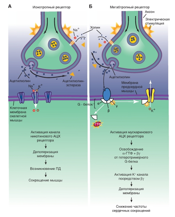 a) типа медиатора и рецепторов, открывающих разные ионные каналы