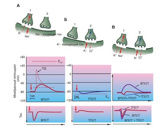 А - процессы освобождения трансмиттера и формирование возбуждающего постсинаптического потенциала (ВПСП) после электрического возбуждения (стрелка), поступившего на пресинаптическое окончание, связаны с возникновением возбуждающего постсинаптического тока (ВПСТ) и генерацией вследствие этого ВПСП. Если ВПСП переходит порог, то возникает потенциал действия (ПД), который во время фазы нарастания благодаря потенциалуправляемым Na+каналам деполяризует мембрану в направлении ENa, т.е. к потенциалу равновесия для Na+. Б - процессы освобождения трансмиттера и формирование ТПСП связаны с ингибиторным постсинаптическим током (ТПСТ) и соответствующим ему ТПСП. При этом ток вызывает движение через мембрану ионов К+. Ионы Cl- могут играть роль, если потенциал мембраны позитивнее, чем потенциал равновесия для Cl-, который лежит от -75 до -70 мВ. В - токи мембраны при активации возбуждающих (ВПСТ) и ингибиторных синапсов (ТПСТ) и возникающие в этом случае результирующие постсинаптические потенциалы (ВПСП, ТПСП). При одновременной активации возбуждающих и тормозных синапсов возникающие мембранные токи суммируются, поэтому результирующий постсинаптический потенциал (красный) становится очень маленьким