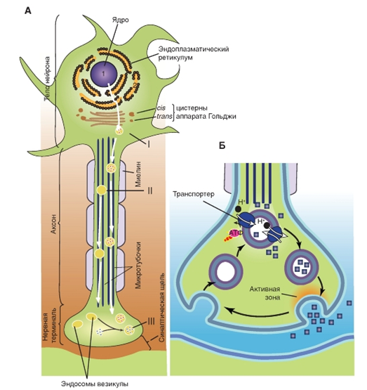 Рис. 16. Синтез и рецикл синаптических везикул и их содержимого.