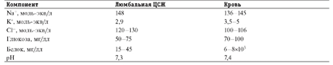 Внеклеточная жидкость в ЦНС непосредственно сообщается с ЦСЖ. Следовательно, состав ЦСЖ влияет на состав внеклеточной среды вокруг нейронов головного и спинного мозга. Основные компоненты ЦСЖ в поясничной цистерне перечислены в табл. 5-1. Для сравнения приведены концентрации соответствующих веществ в крови. Как показано в данной таблице, содержание К+, глюкозы и белков в ЦСЖ ниже, чем в крови, а содержание Na+ и Cl- - выше. Кроме того, в ЦСЖ практически нет эритроцитов. Благодаря повышенному содержанию Na+ и Cl- обеспечивается изотоничность ЦСЖ и крови, несмотря на то, что в ЦСЖ относительно мало белков.
