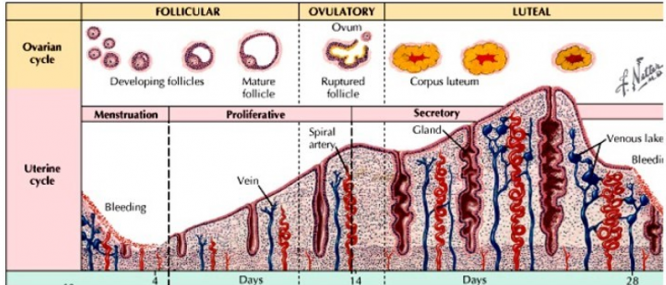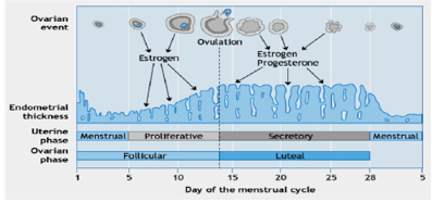 - секреция эстрогенов, прогестерона и ингибина – изменения в эндометрии матки – менструация.