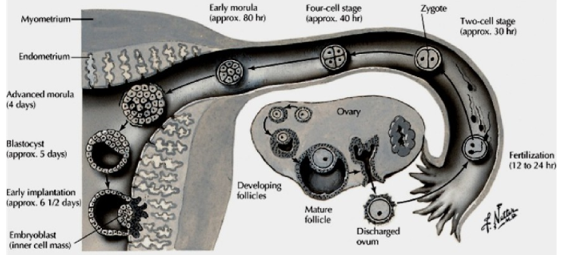 - Оплодотворение происходит в фаллопиевых трубах - пенетрация сперматозоидом, формирование бластоциты, имплантация бластоциты в эндометрий матки,