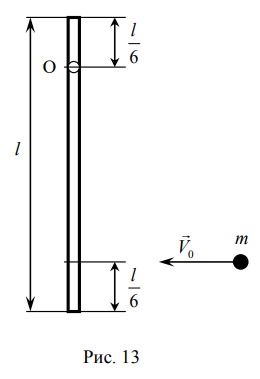 Однородный жёсткий стержень длиной l=1 м и массой M=1 кг свободно висит на горизонтальной идеально гладкой оси вращения О, как показано на рис. 13.
