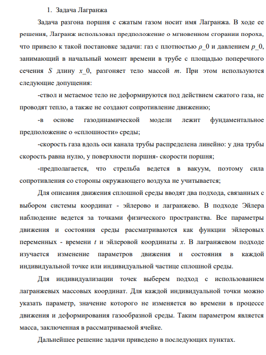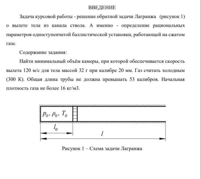 Задача курсовой работы - решение обратной задачи Лагранжа (рисунок 1) о вылете тела из канала ствола. А именно - определение рациональных параметров одноступенчатой баллистической установки, работающей на сжатом газе.