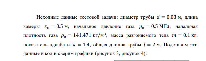 Исходные данные тестовой задачи: диаметр трубы 푑=0.03м, длина камеры 푥0=0.5м, начальное давление газа 푝0=0.5МПа, начальная плотность газа 휌0=141.471кг/м3, масса разгоняемого тела 푚=0.1кг, показатель адиабаты 푘=1.4, общая длинна трубы 푙=2м. Подставим эти данные в код и сверим графики(рисунок 3, рисунок 4):Рисунок 3-Сравнение графиказависимости скоростипоршняот времени с результатомтестовой задачиРисунок 4-Сравнение графиказависимостейдавления на дно канала (сплошная) и дно поршня (пунктир)от времени с результатомтестовой задачиИз рисунков видно, что получившиеся графики схожи, поэтому можно сделать вывод, что программа верно проводит расчеты прямой задачи.Следовательно, прямая задача Лагранжа решена правильно, значит можно переходить к ее оптимизации.Код для решения прямой задачи представлен в Приложении.