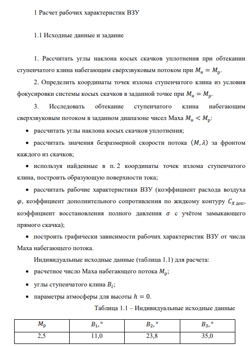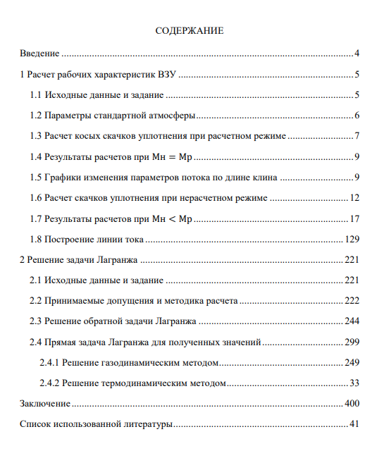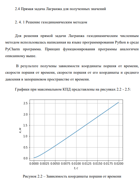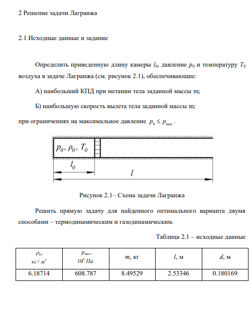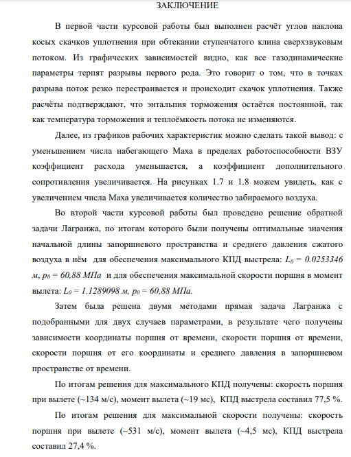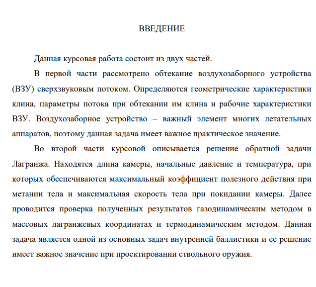 Данная курсовая работа состоит из двух частей. В первой части рассмотрено обтекание воздухозаборного устройства (ВЗУ) сверхзвуковым потоком. Определяются геометрические характеристики клина, параметры потока при обтекании им клина и рабочие характеристики ВЗУ. Воздухозаборное устройство – важный элемент многих летательных аппаратов, поэтому данная задача имеет важное практическое значение. Во второй части курсовой описывается решение обратной задачи Лагранжа. Находятся длина камеры, начальные давление и температура, при которых обеспечиваются максимальный коэффициент полезного действия при метании тела и максимальная скорость тела при покидании камеры. Далее проводится проверка полученных результатов газодинамическим методом в массовых лагранжевых координатах и термодинамическим методом. Данная задача является одной из основных задач внутренней баллистики и ее решение имеет важное значение при проектировании ствольного оружия