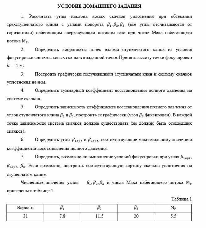 Для студентов МГТУ им. Н.Э.Баумана по предмету Газовая динамикаВариант 29 - Расчет системы косых скачков уплотненияВариант 29 - Расчет системы косых скачков уплотнения