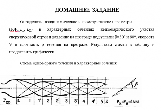 Для студентов МГТУ им. Н.Э.Баумана по предмету Газовая динамикаОпределить газодинамические и геометрические параметры (Fi/Fa, L1, LΣ) в характерных сечениях неизобарического участка сверхзвуковой струи и давлениеОпределить газодинамические и геометрические параметры (Fi/Fa, L1, LΣ) в характерных сечениях неизобарического участка сверхзвуковой струи и давление