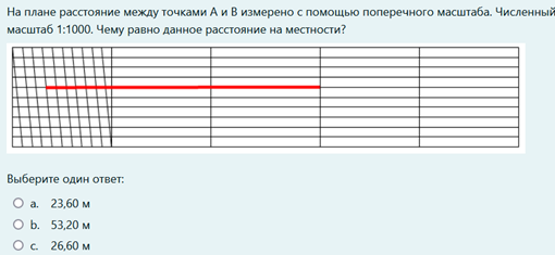 Измеренное на местности горизонтальное расстояние между точками А и В равно 46,60 м. Какой из показанных на нормальном поперечном масштабе отрезков соответствует этому расстоянию? Численный масштаб 1:1000.