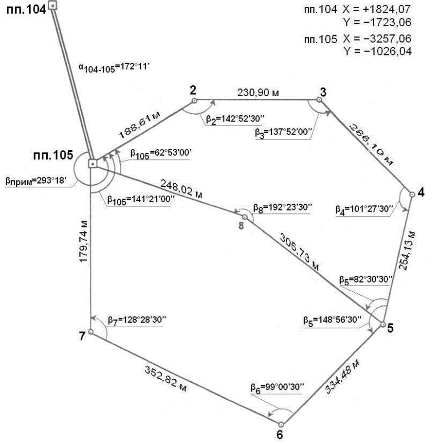 На участке землепользования создана сеть съёмочного обоснования в виде замкнутого и разомкнутого (диагонального) теодолитных ходов. Привязка съёмочной сети выполнена к исходным пунктам полигонометрии II разряда пп.105 и пп.104 с известными координатами X, Y.