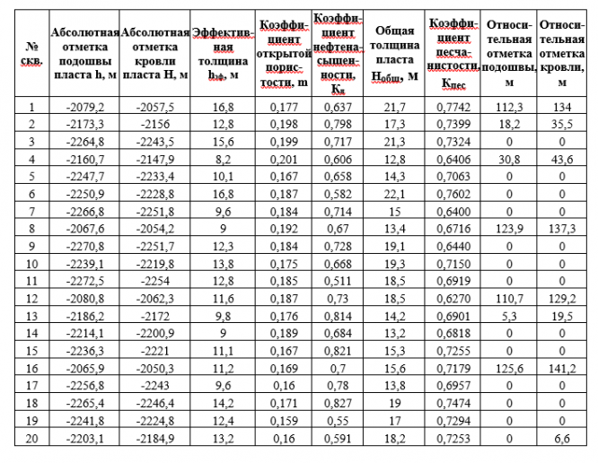 В ходе разведки и разработки Западно-Колтогорского месторождения были получены геофизические характеристики пластово-сводовой залежи углеводородов по данным 20 скважин. Необходимо определить запас углеводородов по представленным характеристикам залежи. Построить график профильного разреза пластово-сводовой залежи.