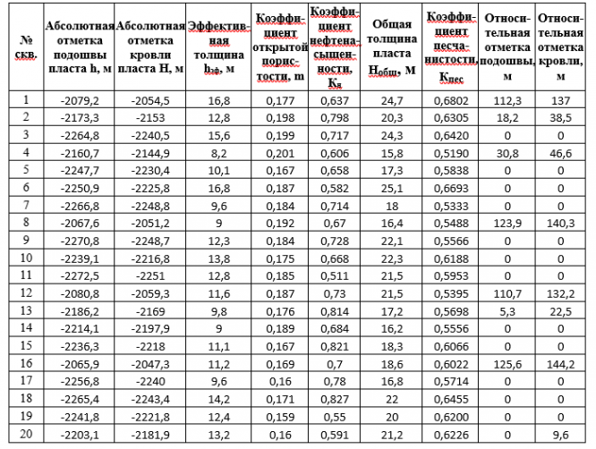 В ходе разведки и разработки Западно-Колтогорского месторождения были получены геофизические характеристики пластово-сводовой залежи углеводородов по данным 20 скважин. Необходимо определить запас углеводородов по представленным характеристикам залежи. Построить график профильного разреза пластово-сводовой залежи.