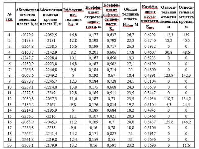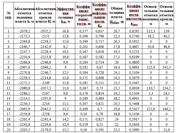 В ходе разведки и разработки Западно-Колтогорского месторождения были получены геофизические характеристики пластово-сводовой залежи углеводородов по данным 20 скважин. Необходимо определить запас углеводородов по представленным характеристикам залежи. Построить график профильного разреза пластово-сводовой залежи.