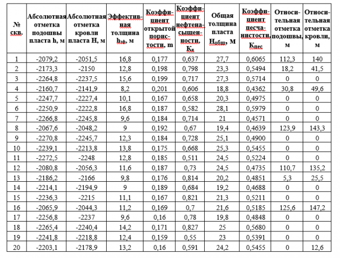 В ходе разведки и разработки Западно-Колтогорского месторождения были получены геофизические характеристики пластово-сводовой залежи углеводородов по данным 20 скважин. Необходимо определить запас углеводородов по представленным характеристикам залежи. Построить график профильного разреза пластово-сводовой залежи.