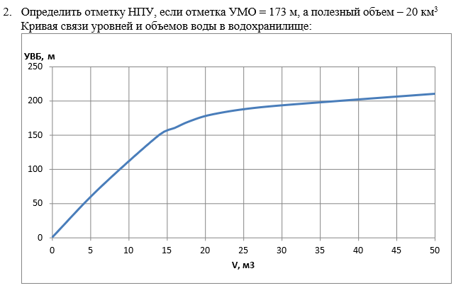 Определить отметку НПУ, если отметка УМО = 173 м, а полезный объем – 20 км3 Кривая связи уровней и объемов воды в водохранилище