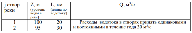5. Дан участок открытого водотока между створами 1 и 2, информация по которым приведена ниже в таблице. Оцените годовую валовую (теоретическую) среднюю мощность и суммарную энергию данного участка водотока.