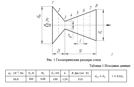 Требуется рассчитать параметры газа, истекающего из ёмкости через сопло Лаваля, имеющее коническую форму и геометрические размеры da , l (рис. 1). Известны также давление p0 , температура Т0 , и число маха Ма на срезе сопла, отношение удельных теплоемкостей kи постоянная R. Исходные данные приведены в таблице 1. По результатам вычислений построить графики изменения давления p, температуры Т, плотности , скорости звука а, скорости течения газа V, числа М по длине сопла, а также определить секундный массовый расход и режим работы сопла. Давление в среде, куда происходит истечение, равно pН = 105 Па.
