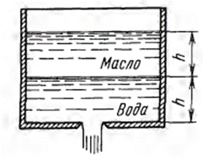 Задача 6.2 Определить, пренебрегая потерями, начальную скорость истечения жидкости из сосуда, заполненного слоями воды и масла (относительный вес δ = 0,8) одинаковой высоты h=1 м. Сравнить полученный результат с начальной скоростью истечения при заполнении сосуда только водой или только маслом до уровня 2h.