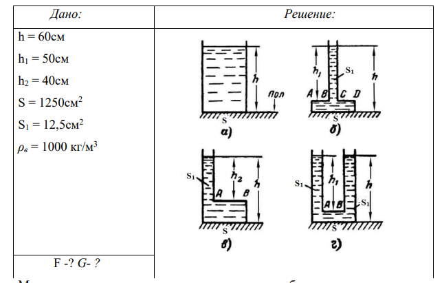 Определите силу манометрического давления р на дно сосудов а, б, в и г, наполненных водой. Высота столба h = 60см, а h1 = 50см и h2 = 40см. Площадь дна сосудов S = 1250см2 , а площадь сечения S1 = 12,5см2 . Найдите силу G, передаваемую в каждом случае на пол, пренебрегая весом сосудов. Почему сила давления на дно не всегда совпадает с весом воды, заключенной в сосуде? Объясните гидростатический парадокс, определив силу манометрического давления РФ, воспринимаемую фасонной частью АВСD (схема б) или АВ (схемы в и г).