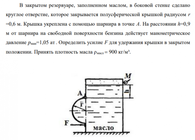 В закрытом резервуаре, заполненном маслом, в боковой стенке сделано круглое отверстие, которое закрывается полусферической крышкой радиусом r =0,6 м. Крышка укреплена с помощью шарнира в точке А. На расстоянии h=0,9 м от шарнира на свободной поверхности бензина действует манометрическое давление рман=1,05 ат . Определить усилие F для удержания крышки в закрытом положении. Принять плотность масла ρмасл = 900 кг/м³.