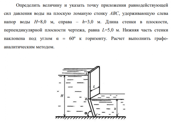 Определить величину и указать точку приложения равнодействующей сил давления воды на плоскую ломаную стенку АВС, удерживающую слева напор воды Н=8,0 м, справа – h=3,0 м. Длина стенки в плоскости, перпендикулярной плоскости чертежа, равна L=5,0 м. Нижняя часть стенки наклонена под углом α = 60º к горизонту. Расчет выполнить графоаналитическим методом.